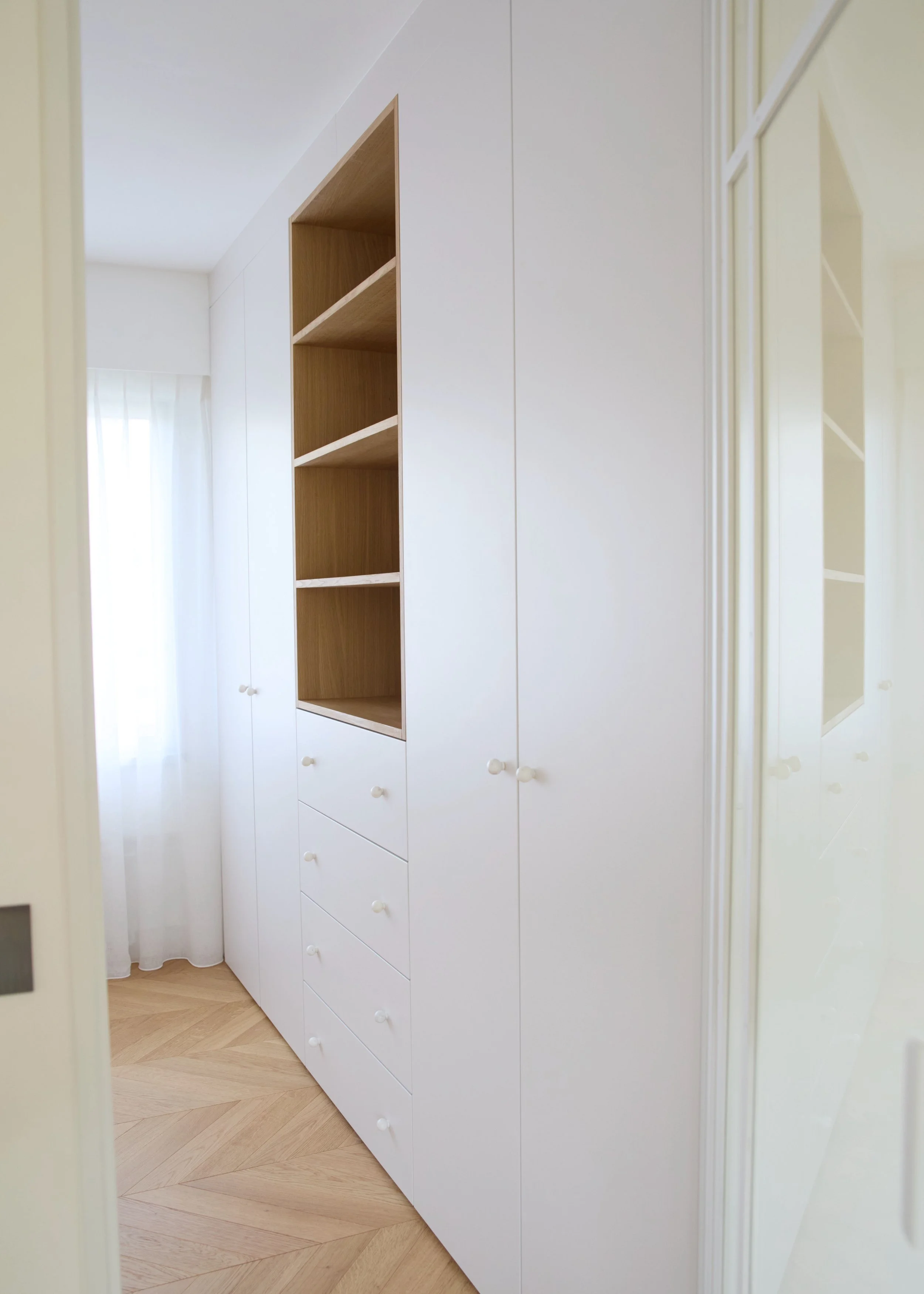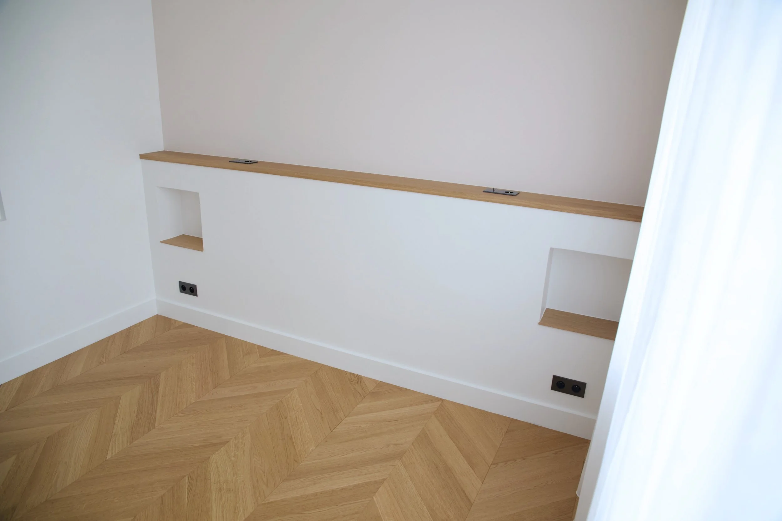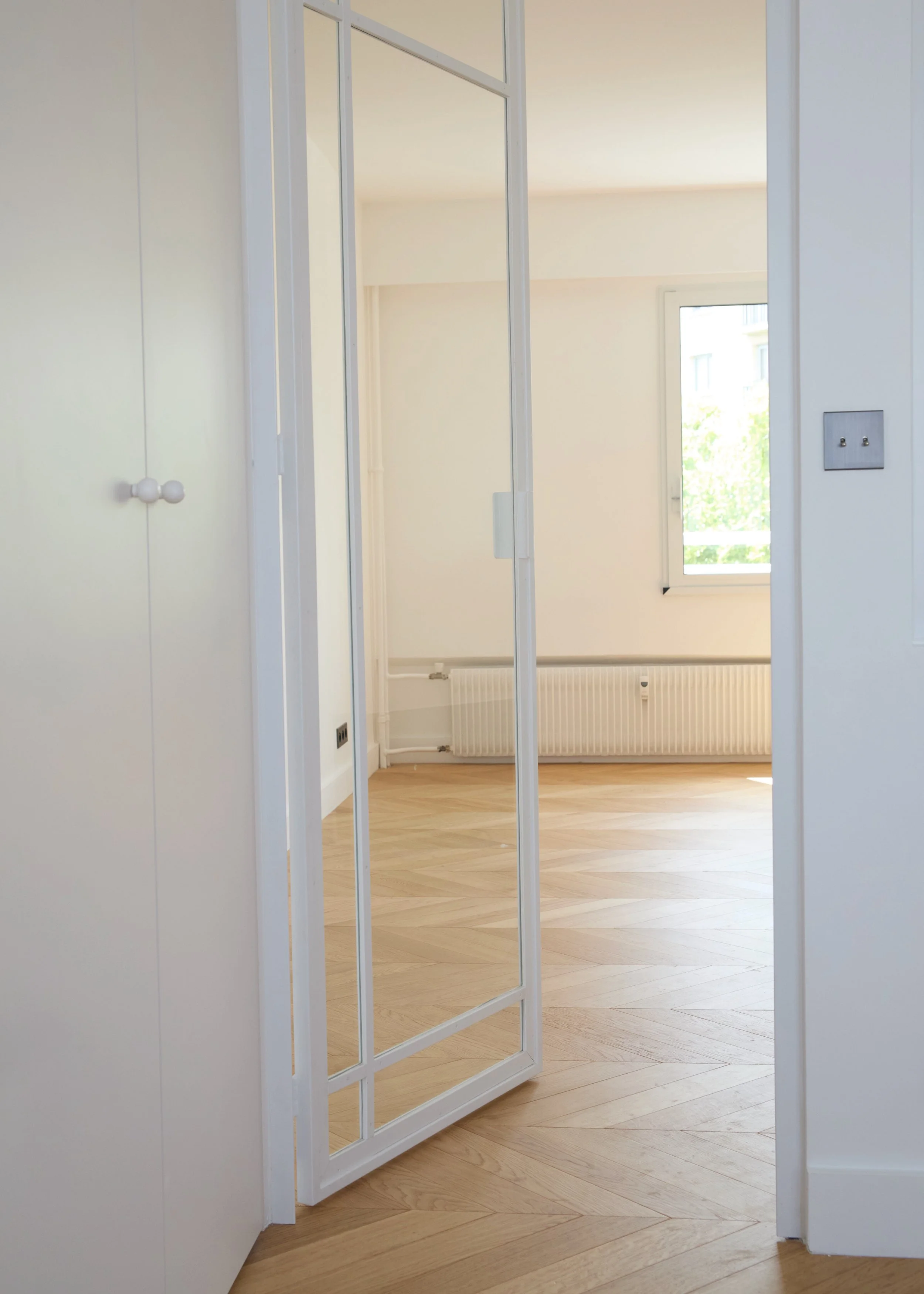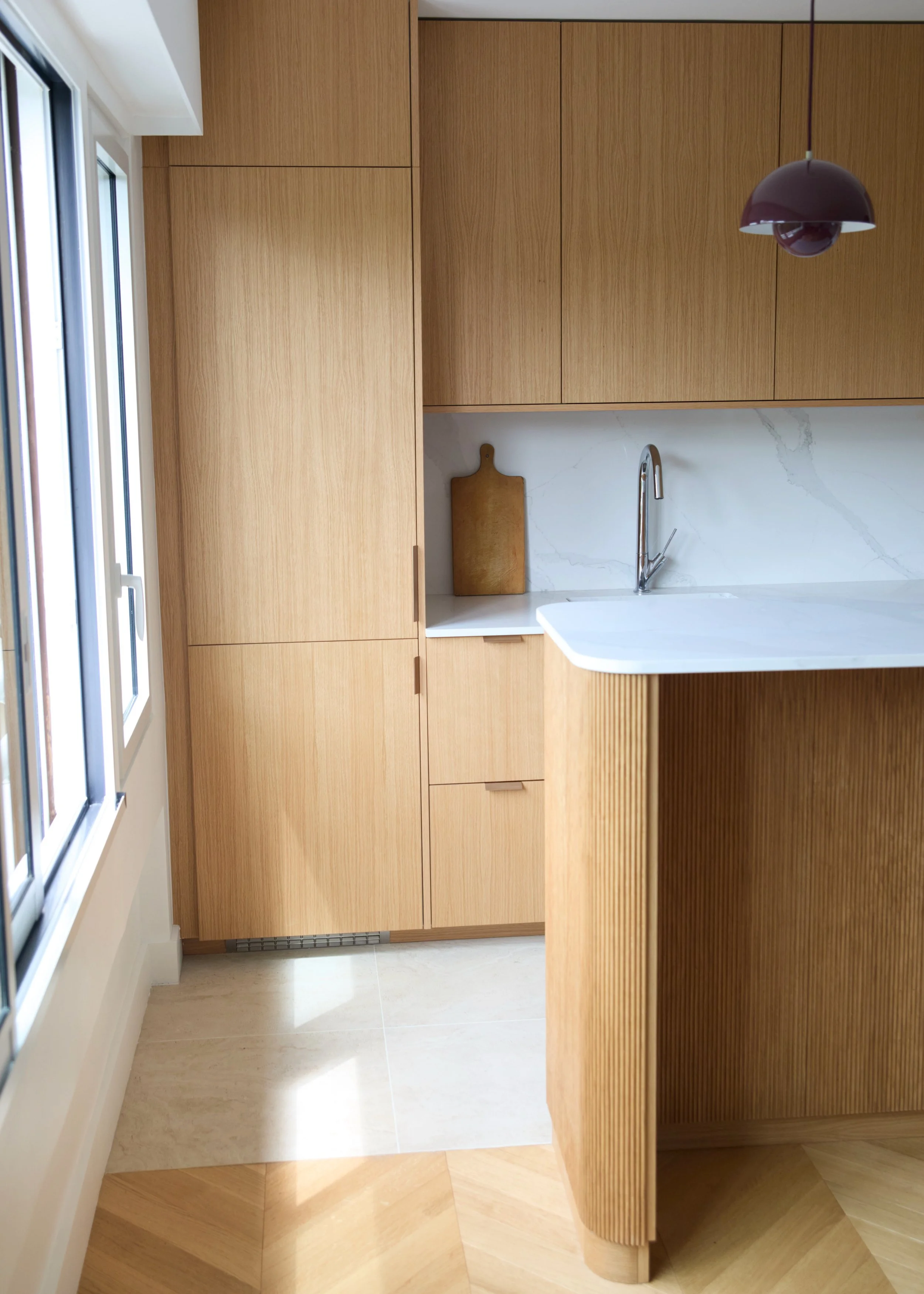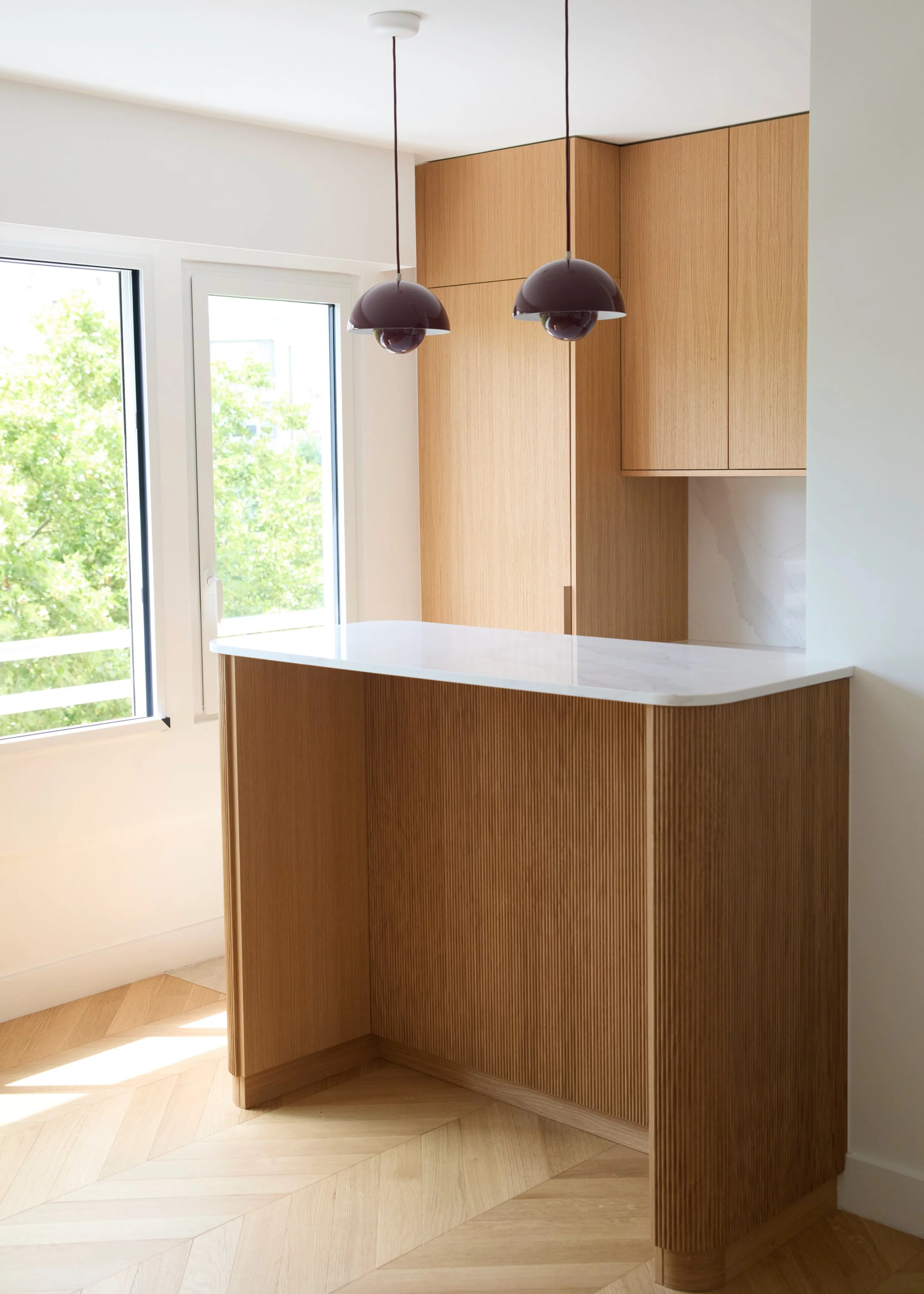 Transformation d’un deux pièces de 41 m² situé dans une petite résidence moderne avec jardin intérieur, datant des années 60-70. Sans style et vétuste, l’appartement était à rénover dans sa totalité, dont en priorité ses revêtements de sol, sa cuisine et sa salle de bain, avec la nécessité d’en optimiser les rangements. Il fallait par ailleurs créer une armoire-dressing dans la chambre, inexistante à l’origine. Le fil conducteur du projet est la lumière naturelle : la faire pénétrer et vibrer en tout point, des murs jusqu’aux sols. Le parquet blond en chêne massif et à chevrons (qui remplace l’ancienne moquette grise des chambre, séjour et entrée) se joue des ombres et des reflets du soleil, tout en redonnant une cohérence à l’ensemble. Afin d’accentuer la luminosité de l’espace et d’y circuler avec plus de fluidité, certains obstacles visuels ont été supprimés, comme les larges portes (accordéon) en noyer de la chambre et de la cuisine ou la porte battante du séjour substituée par une porte coulissante. Relookée et plus fonctionnelle, la cuisine s’ouvre désormais sur le séjour, séparée par un bar aux formes courbes et en chêne plissé ; tandis que dans la chambre, un mur verrière, très graphique, lui apporte par transparence, une nouvelle profondeur. Ce parti pris d’épure souligne l’élégance tout en sobriété de matériaux et de détails luxueux. Les couleurs sont en majorité issues des matières, principalement le chêne clair, naturel, lisse ou texturé, magnifié par la clarté de murs blancs et de surfaces pastel, légèrement contrastés par les tons raffinés des boutons de porte, des poignées de meubles, des interrupteurs ou des luminaires…
