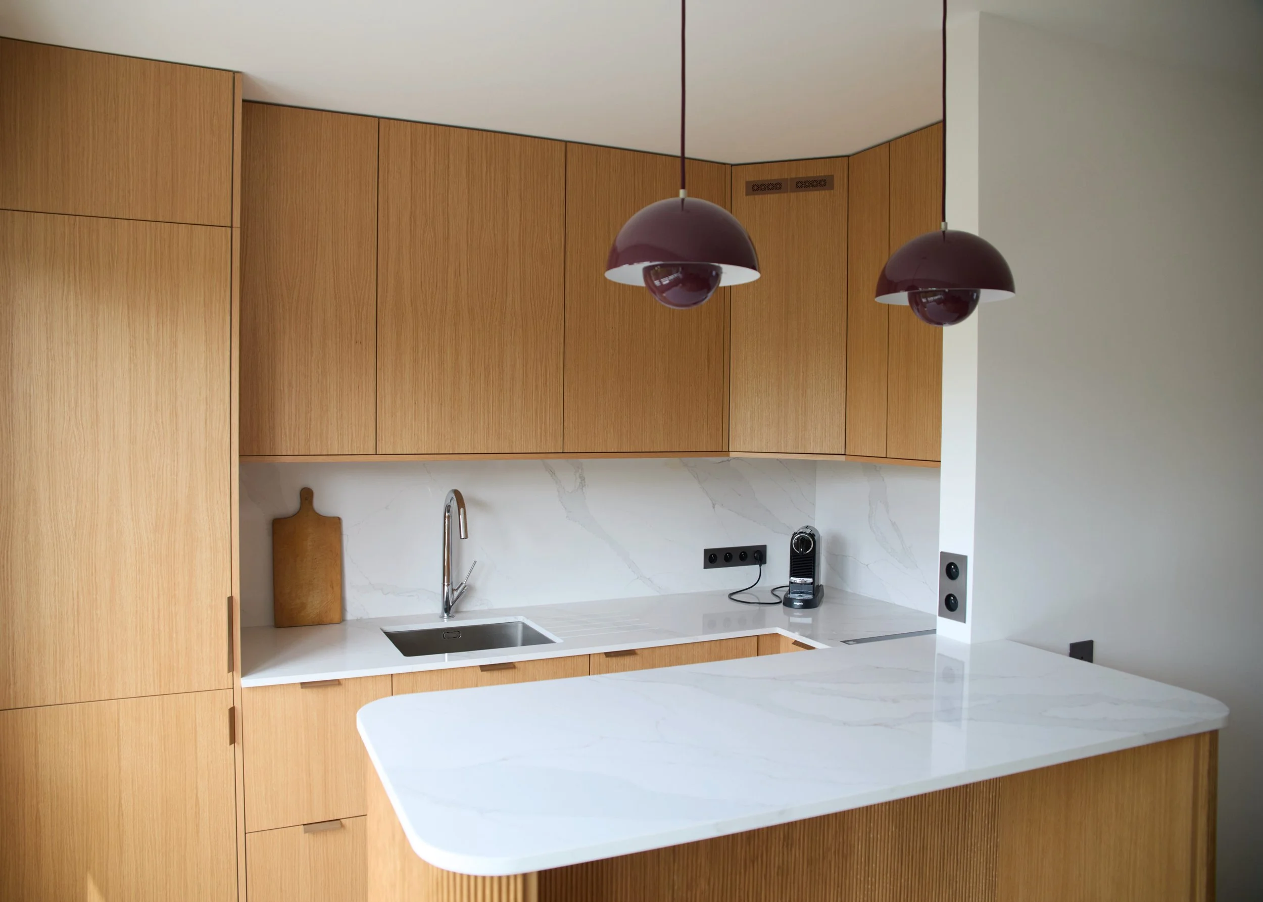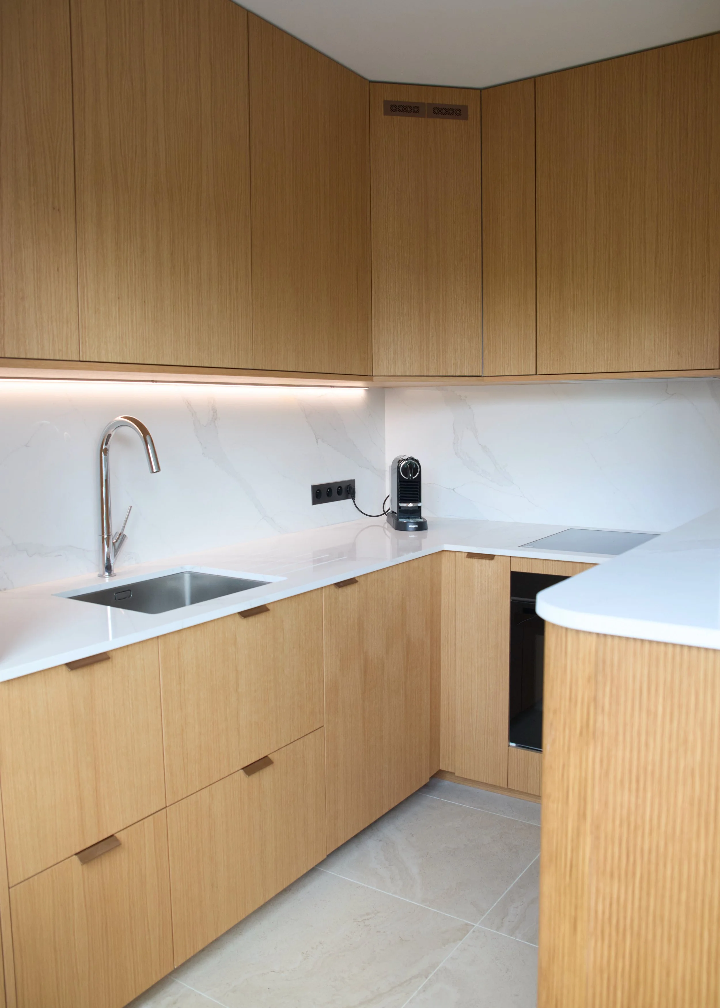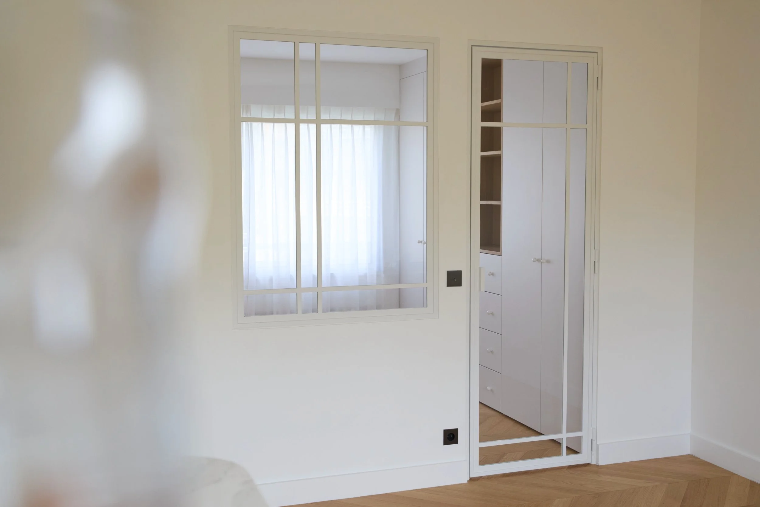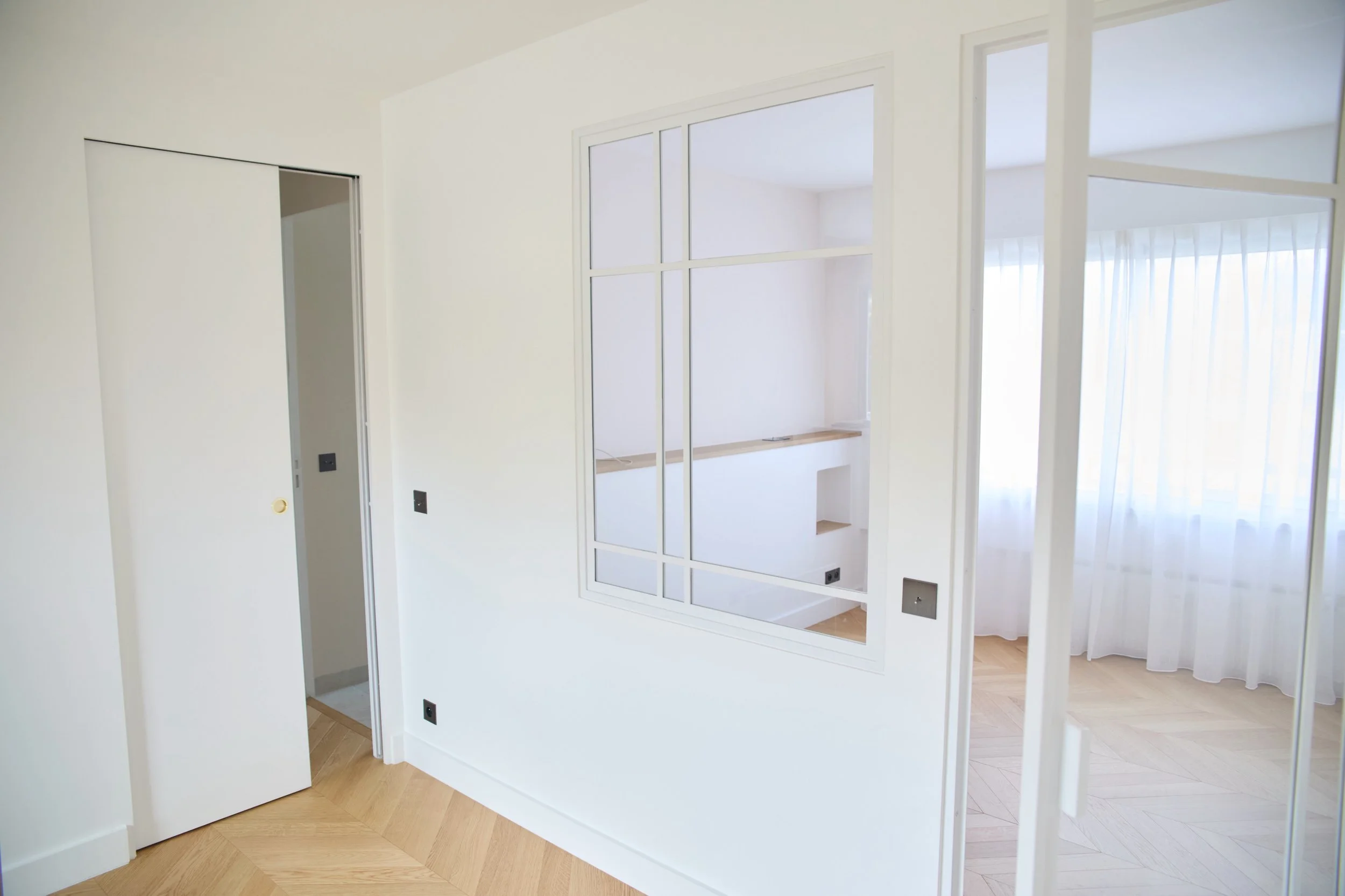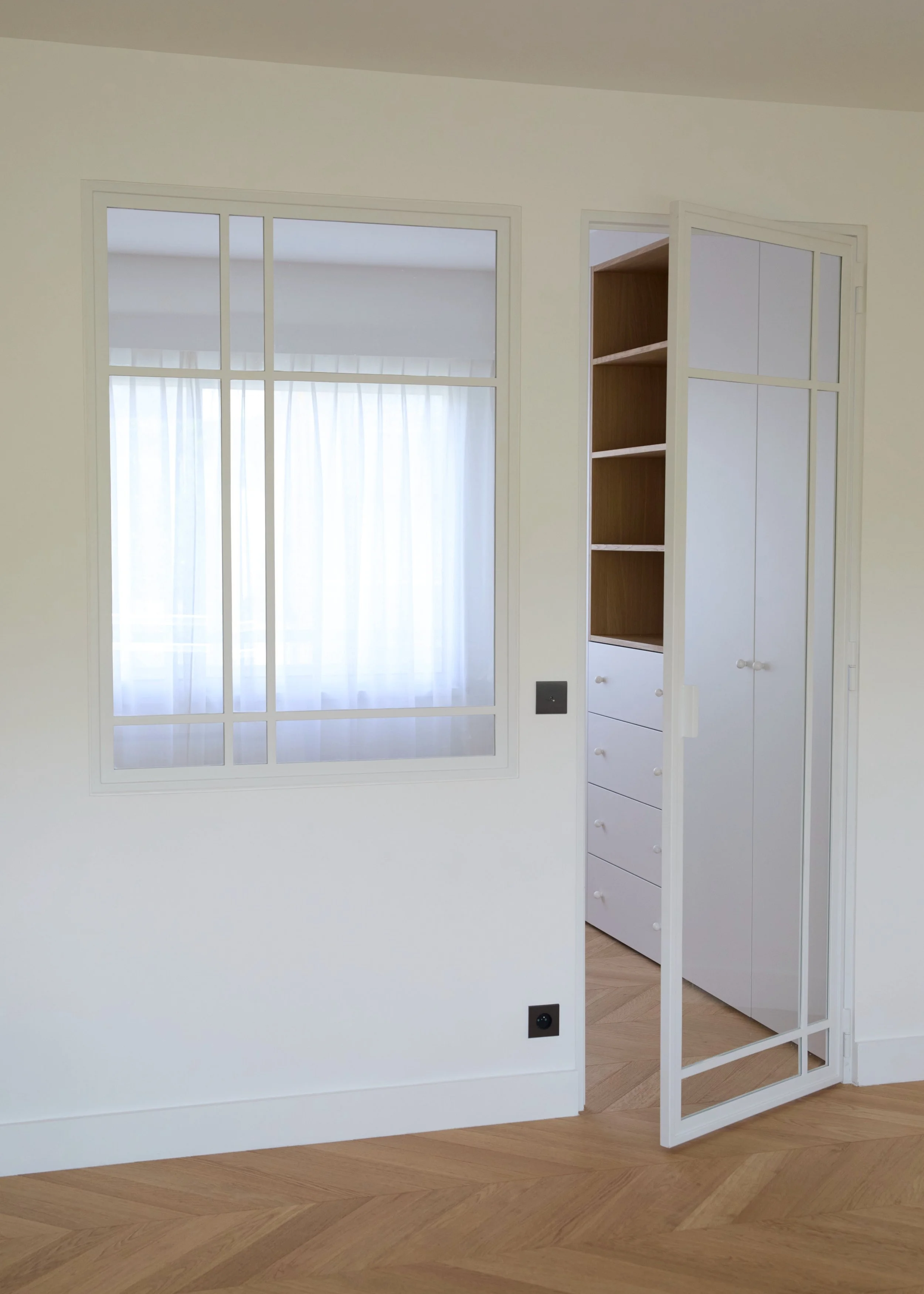 Transformation d’un deux pièces de 41 m² situé dans une petite résidence moderne avec jardin intérieur, datant des années 60-70. Sans style et vétuste, l’appartement était à rénover dans sa totalité, dont en priorité ses revêtements de sol, sa cuisine et sa salle de bain, avec la nécessité d’en optimiser les rangements. Il fallait par ailleurs créer une armoire-dressing dans la chambre, inexistante à l’origine. Le fil conducteur du projet est la lumière naturelle : la faire pénétrer et vibrer en tout point, des murs jusqu’aux sols. Le parquet blond en chêne massif et à chevrons (qui remplace l’ancienne moquette grise des chambre, séjour et entrée) se joue des ombres et des reflets du soleil, tout en redonnant une cohérence à l’ensemble. Afin d’accentuer la luminosité de l’espace et d’y circuler avec plus de fluidité, certains obstacles visuels ont été supprimés, comme les larges portes (accordéon) en noyer de la chambre et de la cuisine ou la porte battante du séjour substituée par une porte coulissante. Relookée et plus fonctionnelle, la cuisine s’ouvre désormais sur le séjour, séparée par un bar aux formes courbes et en chêne plissé ; tandis que dans la chambre, un mur verrière, très graphique, lui apporte par transparence, une nouvelle profondeur. Ce parti pris d’épure souligne l’élégance tout en sobriété de matériaux et de détails luxueux. Les couleurs sont en majorité issues des matières, principalement le chêne clair, naturel, lisse ou texturé, magnifié par la clarté de murs blancs et de surfaces pastel, légèrement contrastés par les tons raffinés des boutons de porte, des poignées de meubles, des interrupteurs ou des luminaires…