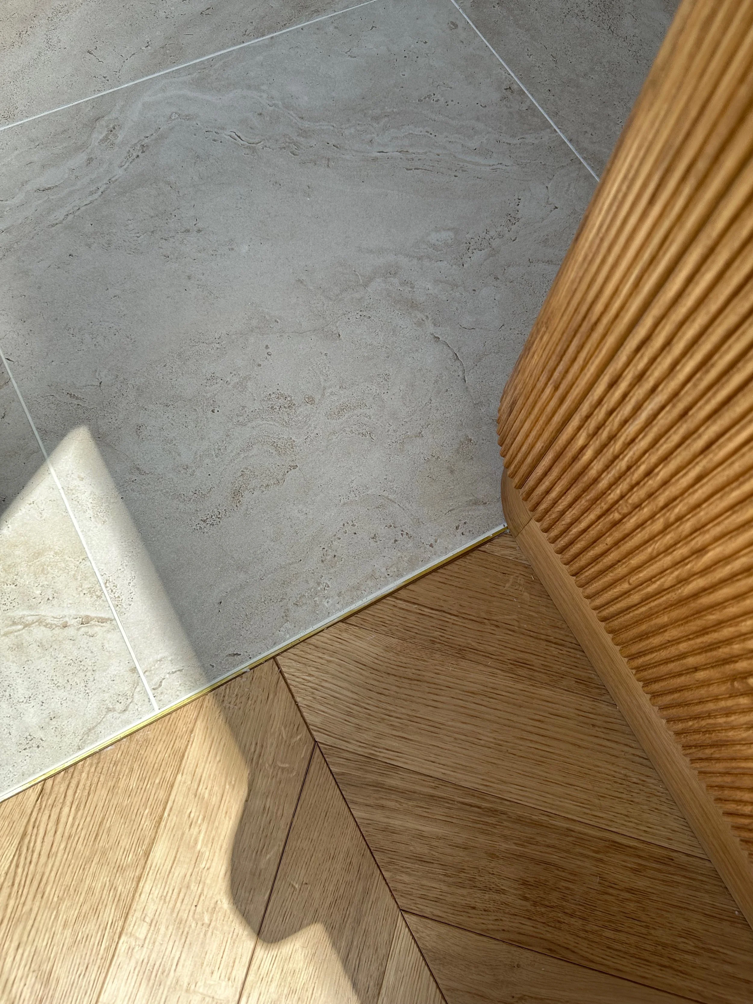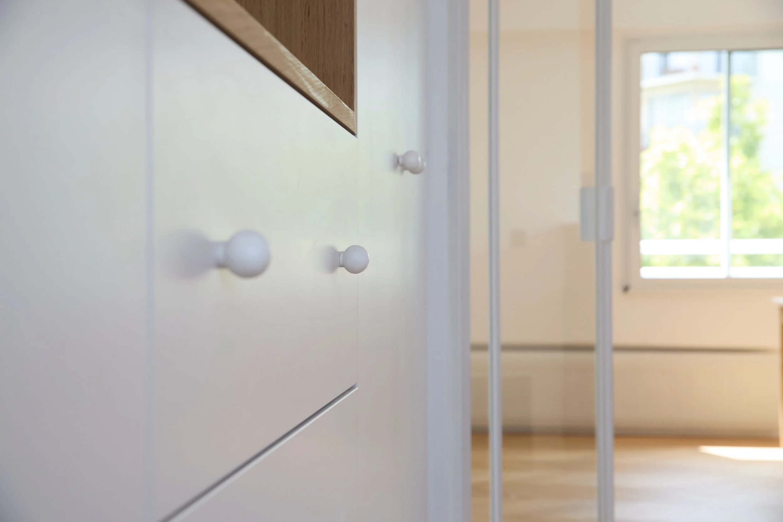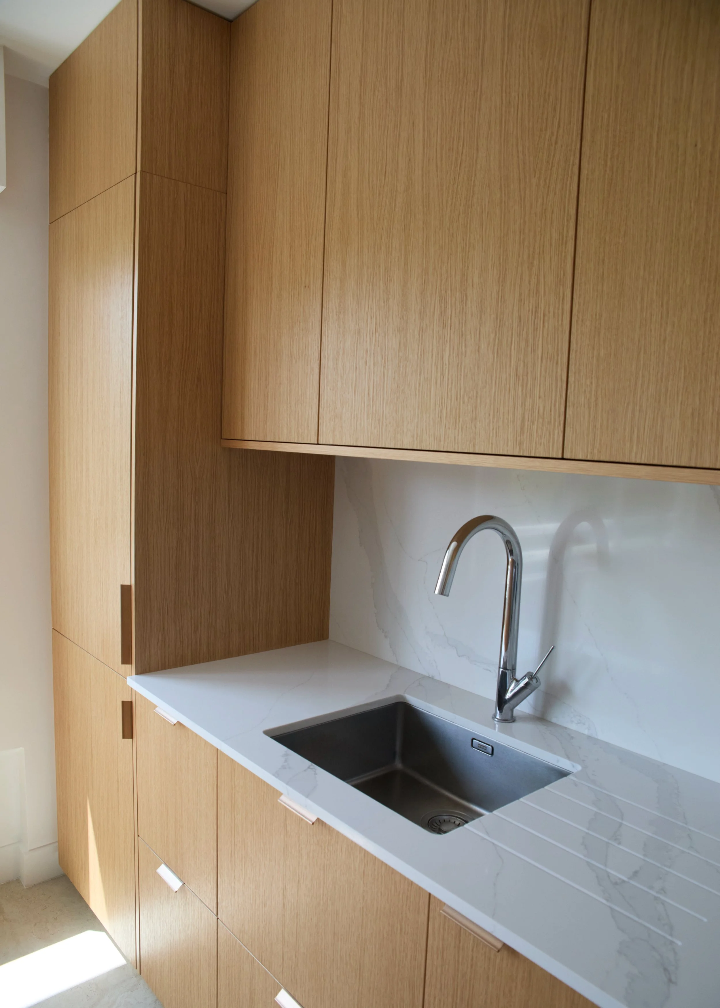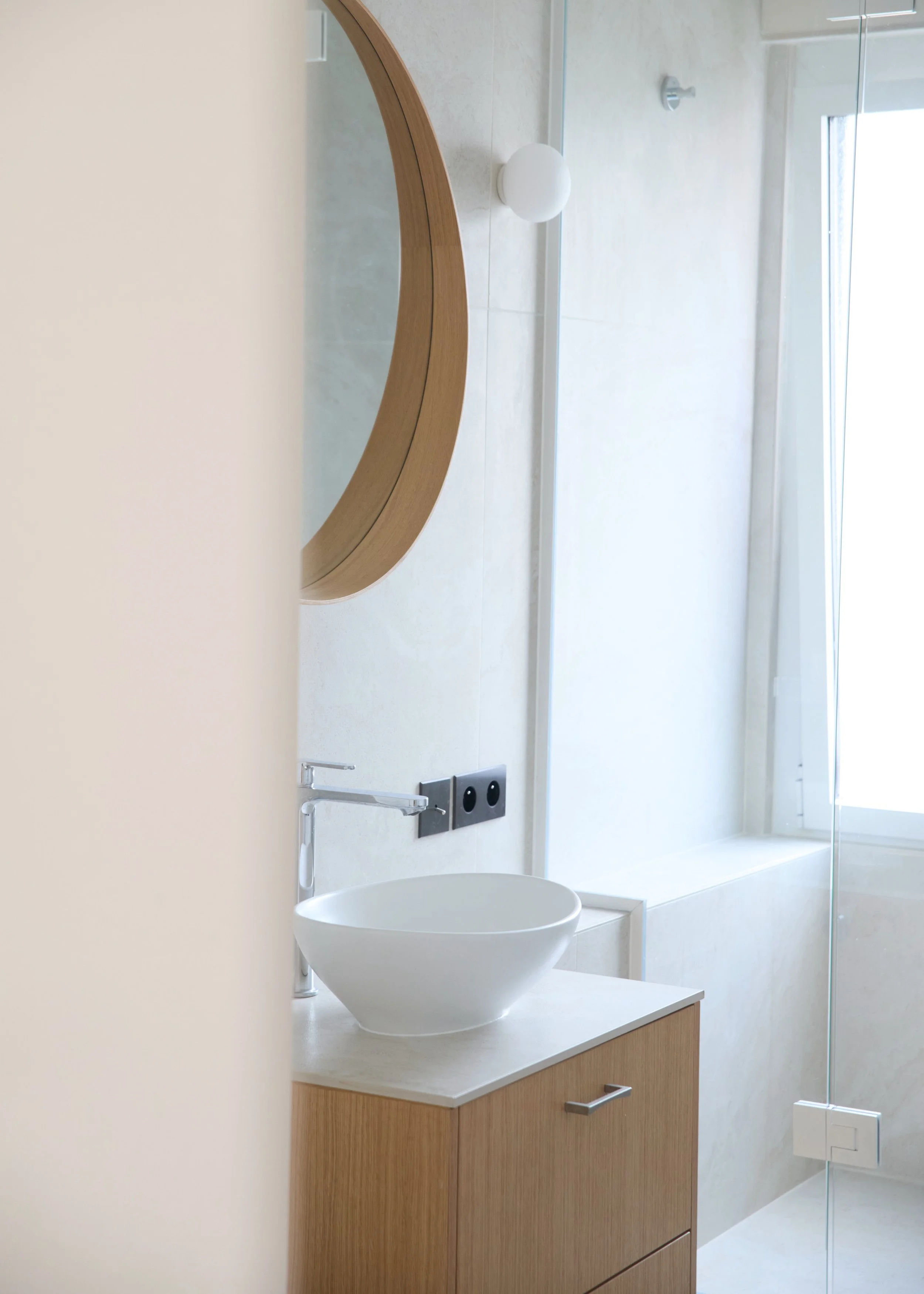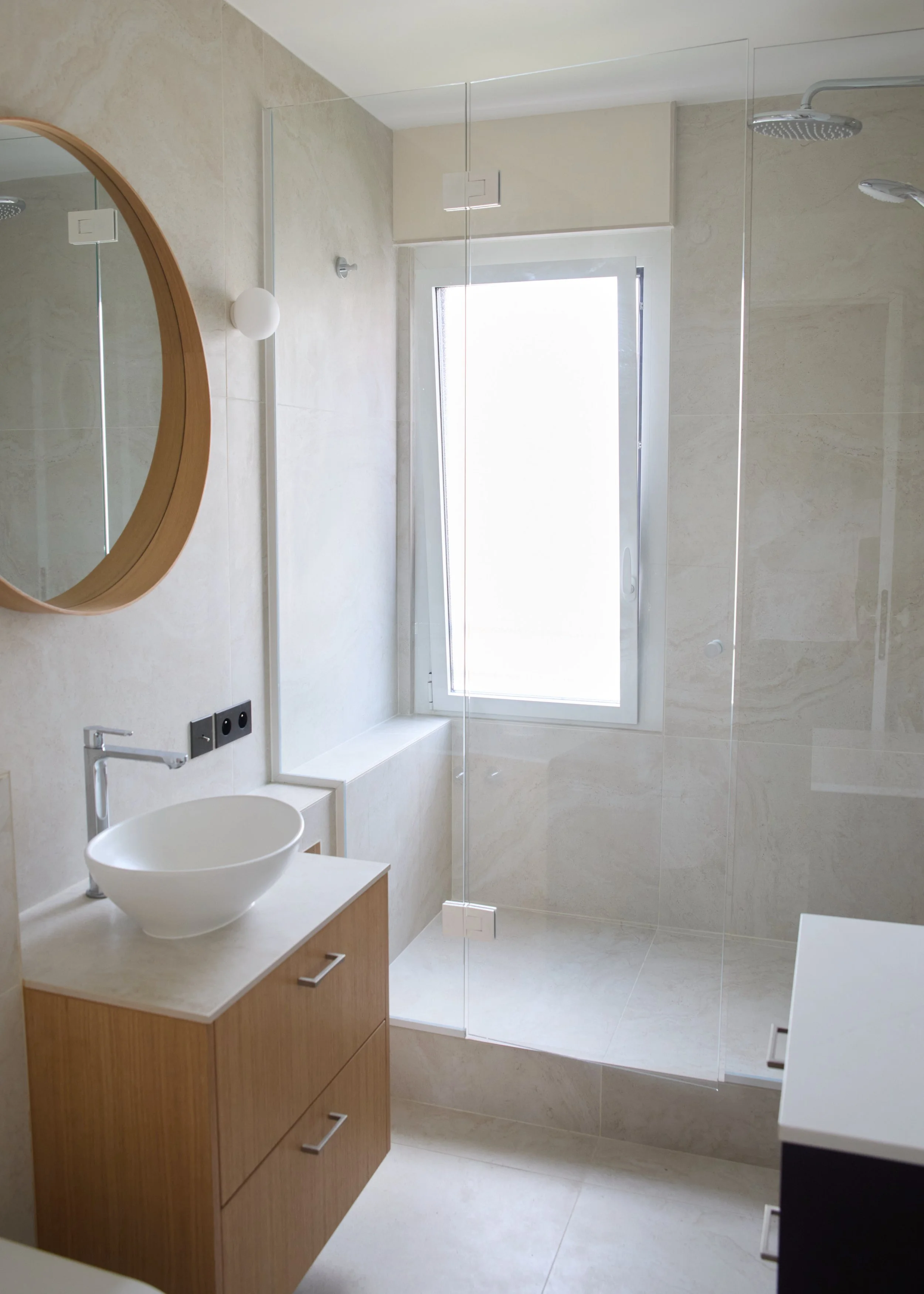 Transformation d’un deux pièces de 41 m² situé dans une petite résidence moderne avec jardin intérieur, datant des années 60-70. Sans style et vétuste, l’appartement était à rénover dans sa totalité, dont en priorité ses revêtements de sol, sa cuisine et sa salle de bain, avec la nécessité d’en optimiser les rangements. Il fallait par ailleurs créer une armoire-dressing dans la chambre, inexistante à l’origine. Le fil conducteur du projet est la lumière naturelle : la faire pénétrer et vibrer en tout point, des murs jusqu’aux sols. Le parquet blond en chêne massif et à chevrons (qui remplace l’ancienne moquette grise des chambre, séjour et entrée) se joue des ombres et des reflets du soleil, tout en redonnant une cohérence à l’ensemble. Afin d’accentuer la luminosité de l’espace et d’y circuler avec plus de fluidité, certains obstacles visuels ont été supprimés, comme les larges portes (accordéon) en noyer de la chambre et de la cuisine ou la porte battante du séjour substituée par une porte coulissante. Relookée et plus fonctionnelle, la cuisine s’ouvre désormais sur le séjour, séparée par un bar aux formes courbes et en chêne plissé ; tandis que dans la chambre, un mur verrière, très graphique, lui apporte par transparence, une nouvelle profondeur. Ce parti pris d’épure souligne l’élégance tout en sobriété de matériaux et de détails luxueux. Les couleurs sont en majorité issues des matières, principalement le chêne clair, naturel, lisse ou texturé, magnifié par la clarté de murs blancs et de surfaces pastel, légèrement contrastés par les tons raffinés des boutons de porte, des poignées de meubles, des interrupteurs ou des luminaires…