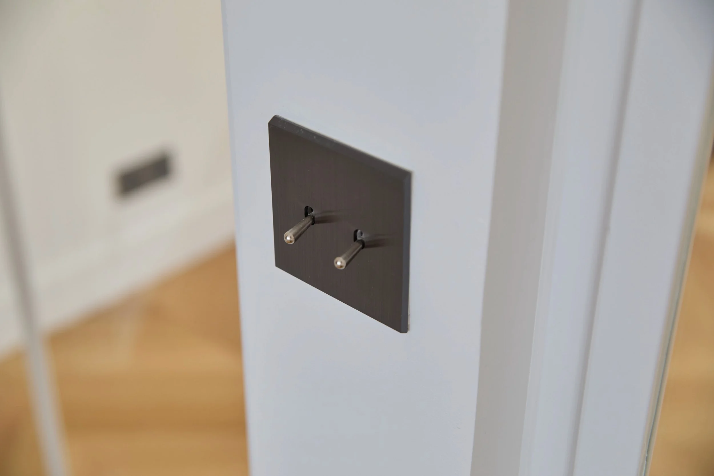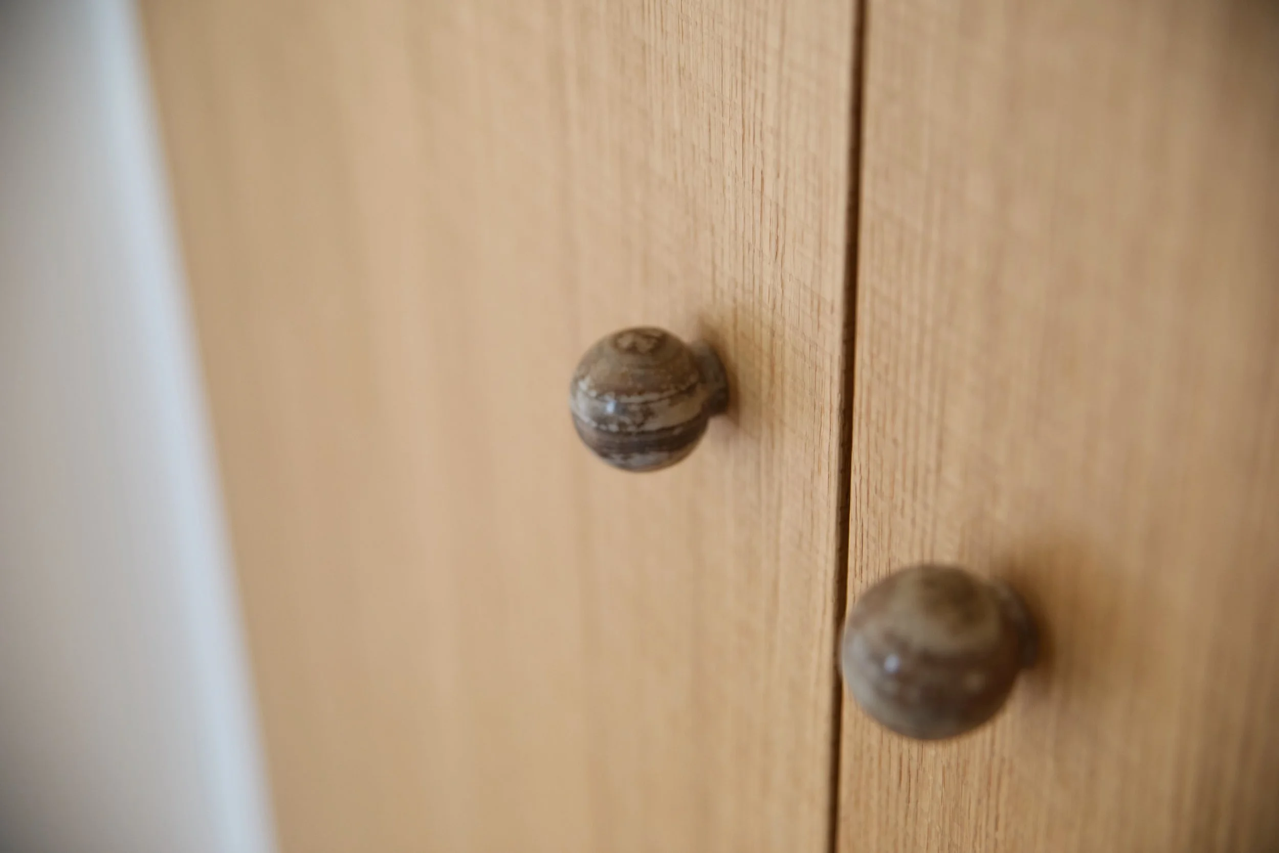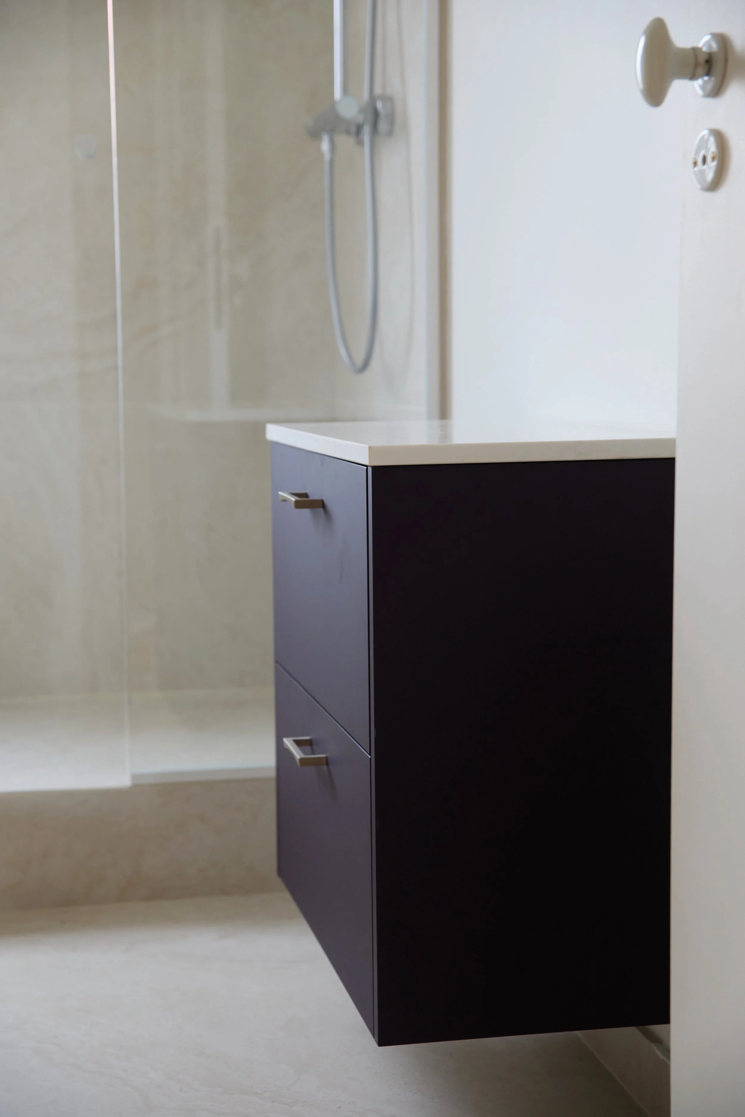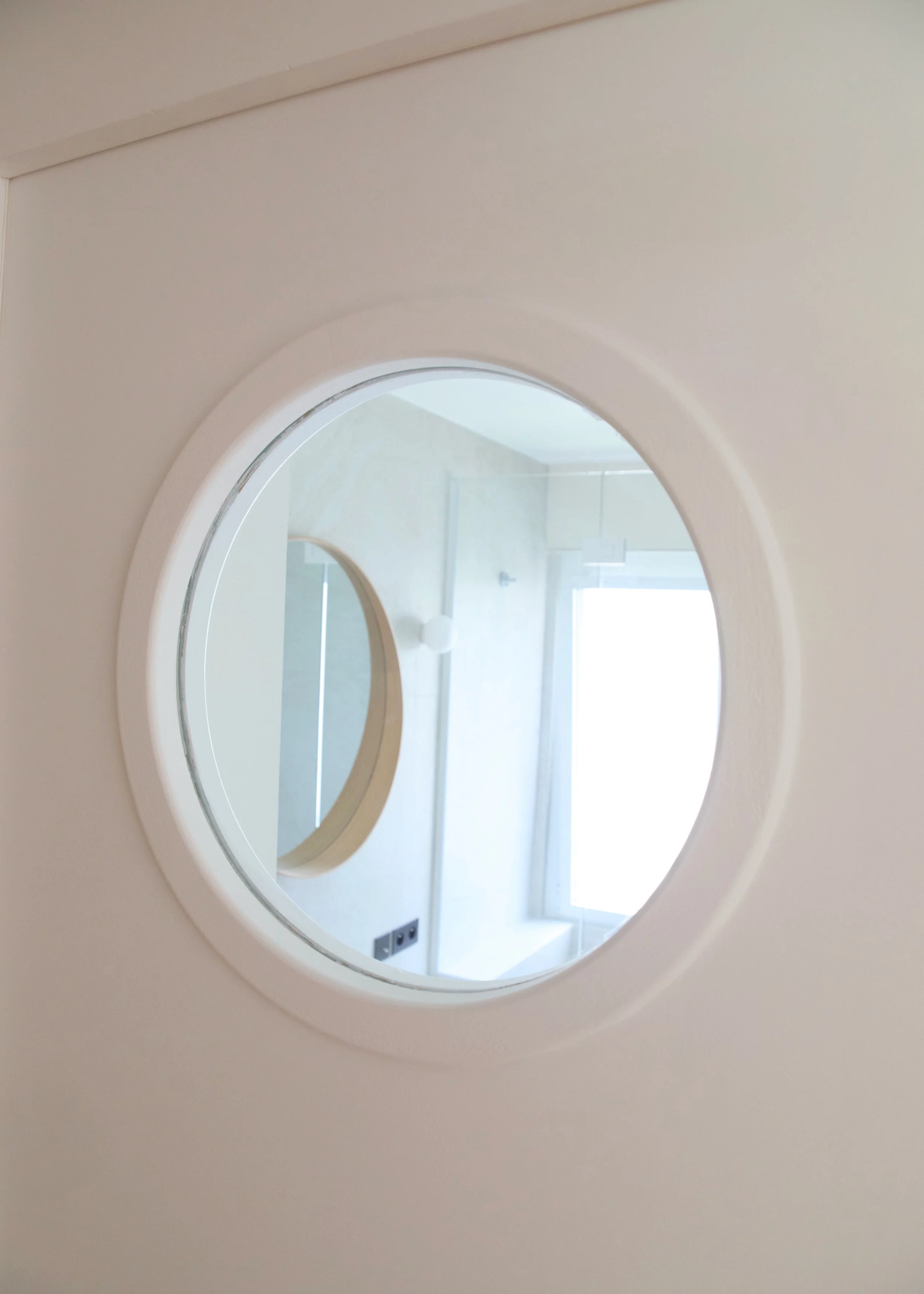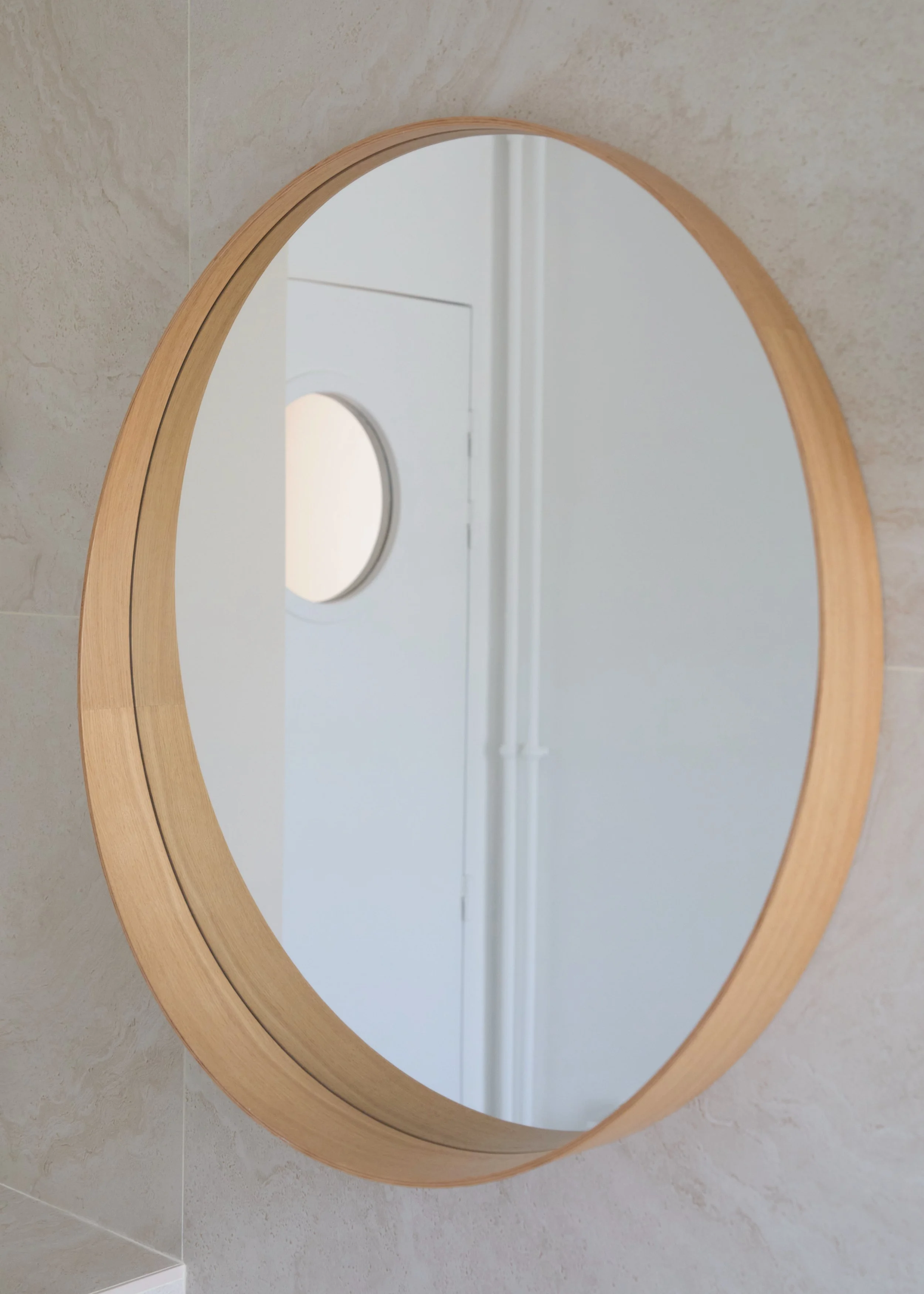 Transformation d’un deux pièces de 41 m² situé dans une petite résidence moderne avec jardin intérieur, datant des années 60-70. Sans style et vétuste, l’appartement était à rénover dans sa totalité, dont en priorité ses revêtements de sol, sa cuisine et sa salle de bain, avec la nécessité d’en optimiser les rangements. Il fallait par ailleurs créer une armoire-dressing dans la chambre, inexistante à l’origine. Le fil conducteur du projet est la lumière naturelle : la faire pénétrer et vibrer en tout point, des murs jusqu’aux sols. Le parquet blond en chêne massif et à chevrons (qui remplace l’ancienne moquette grise des chambre, séjour et entrée) se joue des ombres et des reflets du soleil, tout en redonnant une cohérence à l’ensemble. Afin d’accentuer la luminosité de l’espace et d’y circuler avec plus de fluidité, certains obstacles visuels ont été supprimés, comme les larges portes (accordéon) en noyer de la chambre et de la cuisine ou la porte battante du séjour substituée par une porte coulissante. Relookée et plus fonctionnelle, la cuisine s’ouvre désormais sur le séjour, séparée par un bar aux formes courbes et en chêne plissé ; tandis que dans la chambre, un mur verrière, très graphique, lui apporte par transparence, une nouvelle profondeur. Ce parti pris d’épure souligne l’élégance tout en sobriété de matériaux et de détails luxueux. Les couleurs sont en majorité issues des matières, principalement le chêne clair, naturel, lisse ou texturé, magnifié par la clarté de murs blancs et de surfaces pastel, légèrement contrastés par les tons raffinés des boutons de porte, des poignées de meubles, des interrupteurs ou des luminaires…